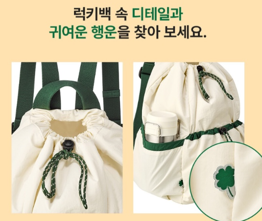 이번 백팩은 디테일이 상당히 뛰어납니다. 하단에 박힌 스타벅스 로고와 귀여운 네잎클로버 자수 등 디자인적 요소가 많아 텀블러 구성품보다 가방 자체를 탐내는 분들이 많습니다.