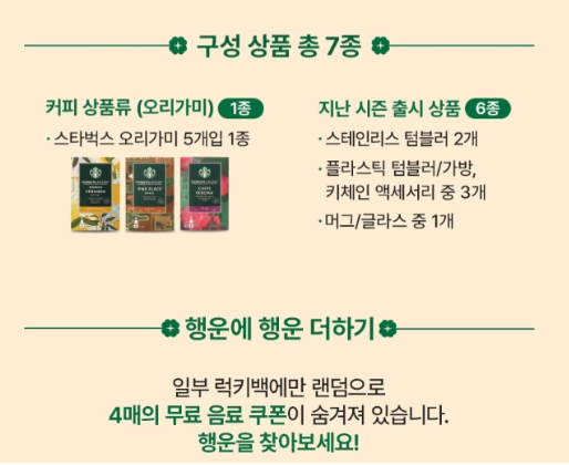 - 추가 행운: 일부 럭키백에는 무료 음료 쿠폰 4매가 랜덤으로 숨겨져 있습니다.